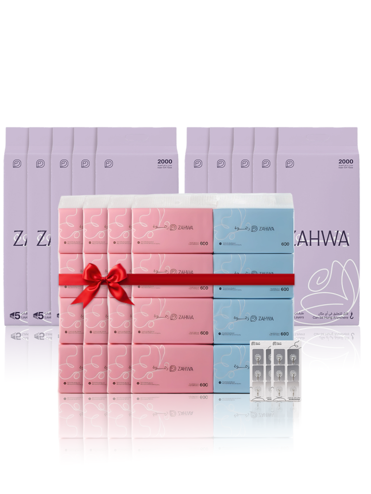 بكج مناديل 2000 جامبو 5 عبوات + بكج مناديل ناعمة كلاسيك 32 عبوة + بكج مناشف ناعمة معلقة 4 عبوات + شحن مجاني + 12 علاقة هدية.