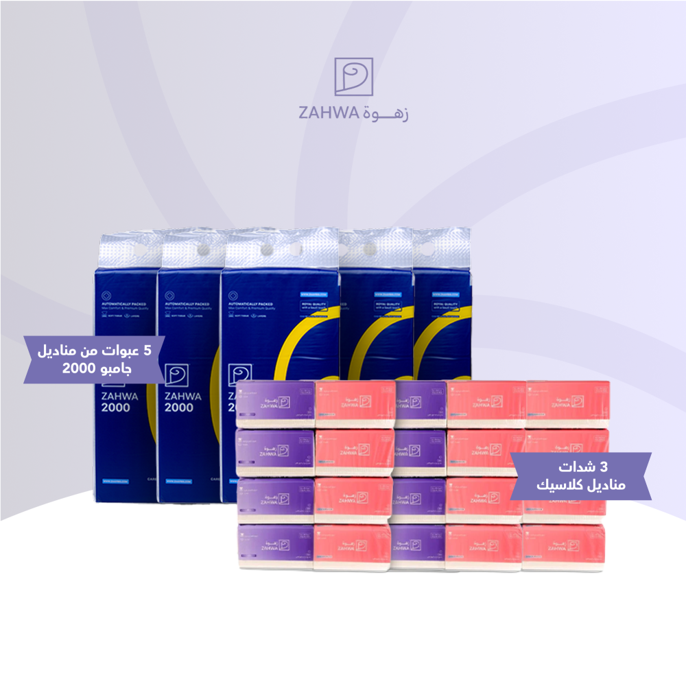 مناديل ورقية زهوة الجامبو الجديد 2000 منديل العبوة الكحلى – بكج ٥ عبوات مناديل طويلة.